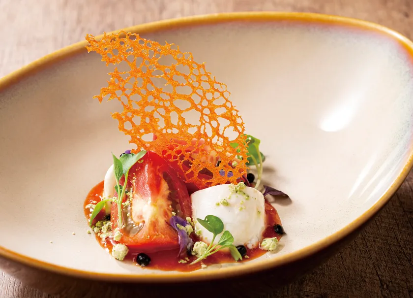 イタリア職人が作る北海道産モッツァレラチーズと糖度の高いフルーツトマトを使用。トマトは蜂蜜とレモンでマリネして、更に甘味を引き出しています。冷製のクーリートマトソースとアガーで固めた黒い粒状のバルサミコとの絶妙なハーモニーをお楽しみください。