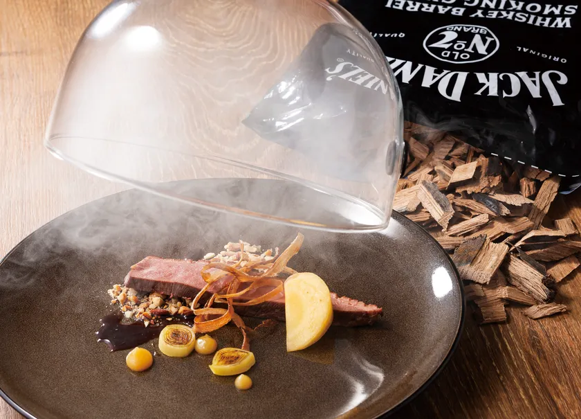 低温で長時間火を通した鴨のむね肉は、柔らかく、凝縮されたうま味が口に広がる逸品です。お客さまのテーブルで燻製カバーをオープンする温かい前菜で、食欲をそそる芳醇で甘い香りは「ジャック ダニエル(ウィスキー)」のオーク樽と桜のチップのブレンドスモーク。ファイブスパイス(五香粉)のオリエンタルな味わいが特徴のソースや、ヴェルジュに漬けた柿のジェルともにさっぱりお召し上がりいただけます。添え野菜には、鴨肉との相性が良いネギや食感が楽しいごぼうチップスをご用意しました。