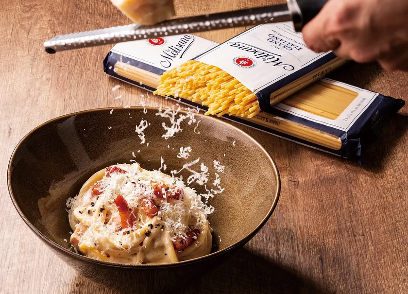 90年近い長い歴史によって培われた技術と製法にこだわり続ける「浅草ハム」の素朴で奥深い味わいのベーコンと、イタリアのプレミアム・パスタブランド「ラ・モリサーナ」のブカティーニによる、和と伊の共演が楽しめる一品。中心に穴が開いているブカティーニに濃厚なソースがよく絡みます。香り高いインド産の胡椒と削りたてのチーズの香りと共にご堪能ください。