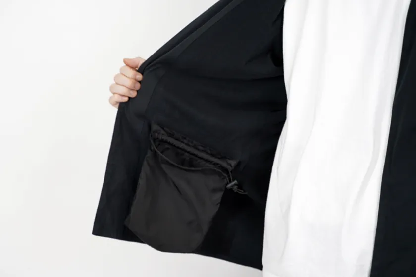 ・内側の巾着袋をポケットとして、カーディガンを小さく畳んで収納可能。