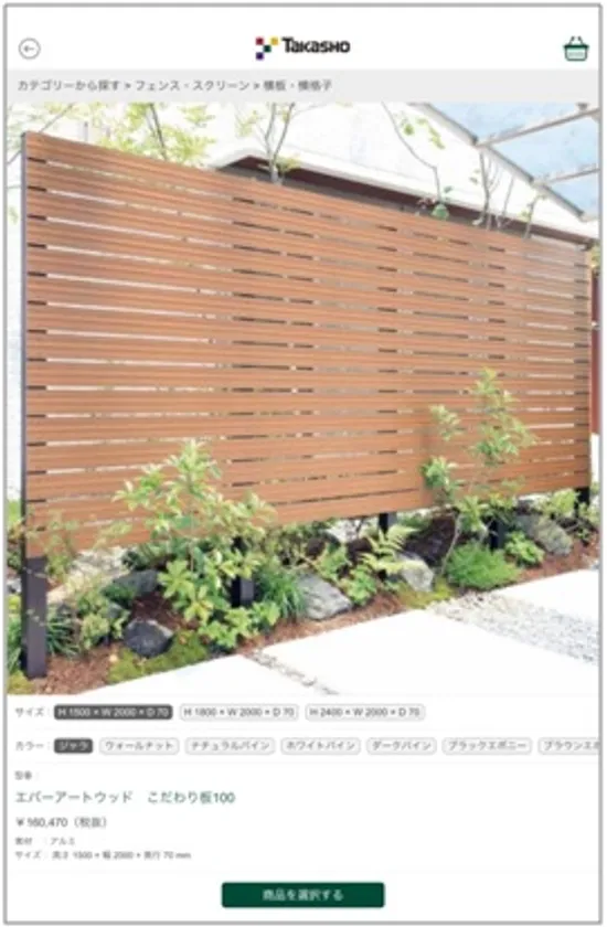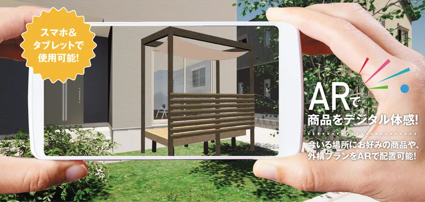 お手持ちのスマートフォン・タブレットを使って、実際の外構現場やお客様の庭など、その場で空間に見たい商品を指先ひとつで表示することができ、簡単に空間イメージを提案することができます。購入の検討段階で「ショールームで見たけど、実際に自宅の外構の雰囲気と合うか分からない」や「自分の庭に設置できるサイズか分からない」などのお客様の声にお応えします。お客様自身でもシミュレーションが可能な簡単操作で、これまでにない新たな購入体験を実現します。
