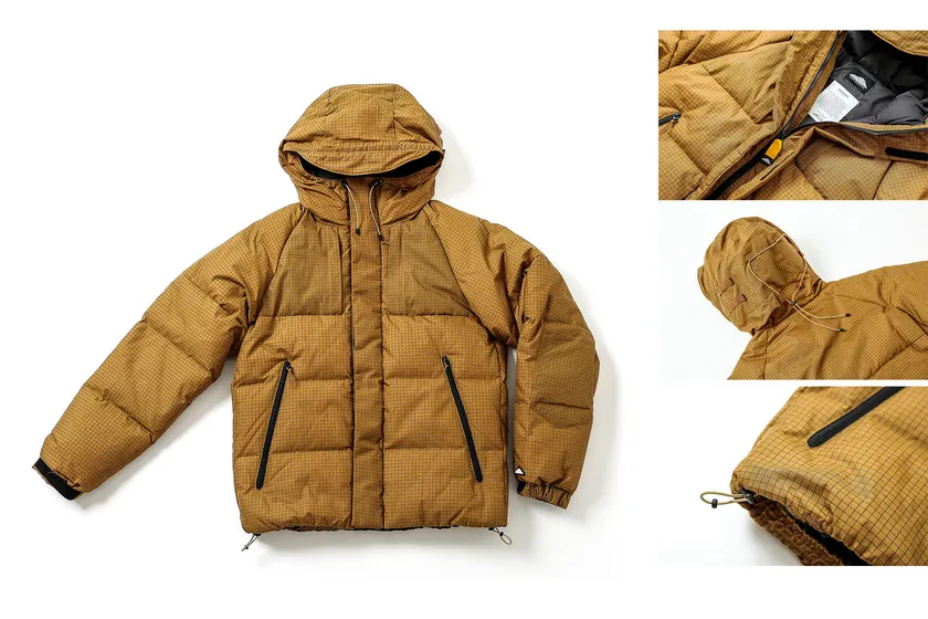 「リサイクルスペクトラナイロン」使用した700フィルパワーのショートダウンジャケット。フードには、バッグからインスパイアされたドローコードデザインを採用しています。ホワイトグースダウンを使用した軽やかな仕上がりです。