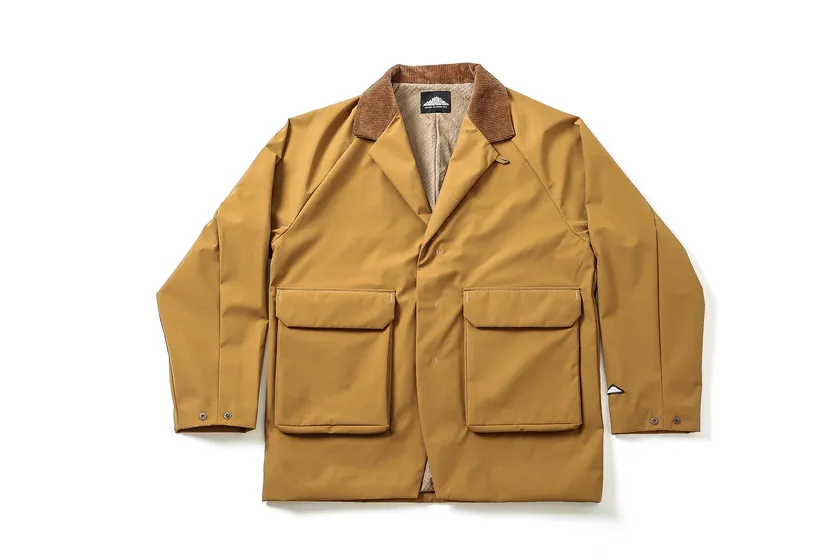 フロントには耐久性と軽量性を兼ね備えた「Robic-air(R)」リサイクルナイロンを使用したジャケット。3レイヤーの素材なので防水、防風の機能も備えている。衿にはコーデュロイを組み合わせ、クラシカルなハンティングジャケットのような印象に。