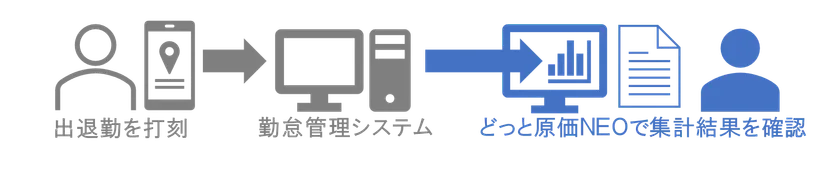 他社製ソフト「勤怠管理システム」から出力されたデータが自動的にどっと原価NEOに労務原価として取り込まれます。これにより、リアルタイムかつ効率的な出面集計・労務原価集計が可能となります。