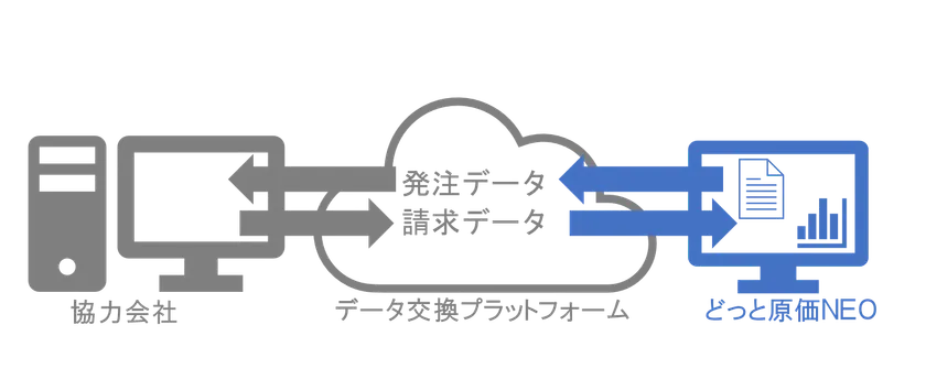協力会社との発注・請求データを他社製「データ交換プラットフォーム(改正電子帳簿保存法対応)」で共有し、かつ、協力会社からの請求書データを自社で承認することで、原価データとしてどっと原価NEOに定期的に自動取込みされます。これにより手作業による人為的なミス(漏れ・重複・入力間違いなど)と業務時間、経費が大幅に低減され、受発注業務の大幅な効率化が期待できます。