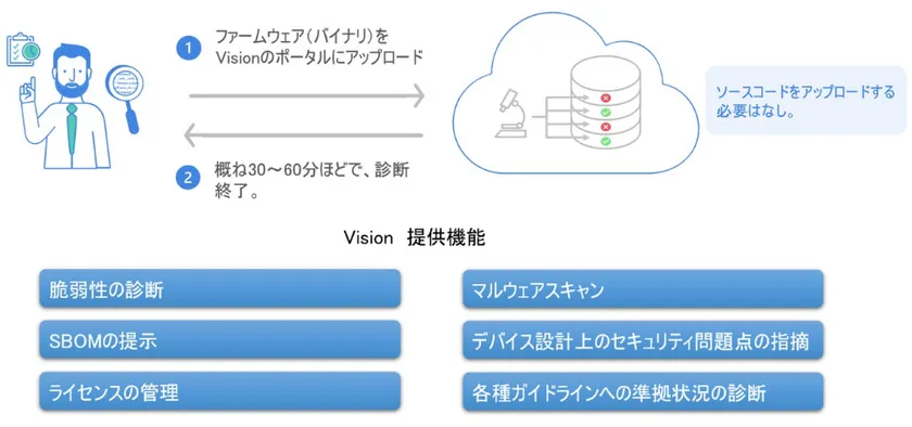 本セキュリティ診断サービスは、ビドゥ社が有するVdoo Vision※と呼ばれるIoTセキュリティ診断機能をベースにしたセキュリティ診断です。設計書やソースコード等を必要とせずに、IoT機器に搭載されているソフトウェアそのままの形で数分から数十分程度で診断することが可能となります。