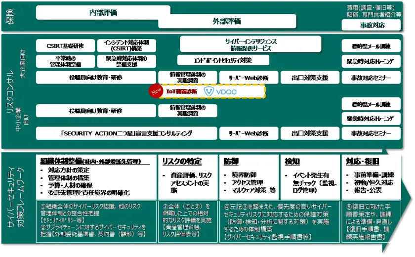MS&ADインシュアランス グループは、サイバーセキュリティ対策フレームワークの各項目に対応するソリューション(セキュリティ対策のコンサルティングや保険の導入等)を“サイバーセキュリティ・MS&ADプラットフォーム”としてまとめています。今回、共同開発を進める「IoT機器サイバーセキュリティ診断サービス」は、サイバーセキュリティ対策フレームワーク中の「リスクの特定・防御」に対応する、IoT機器向けのリスクコンサルティングメニューとなります。