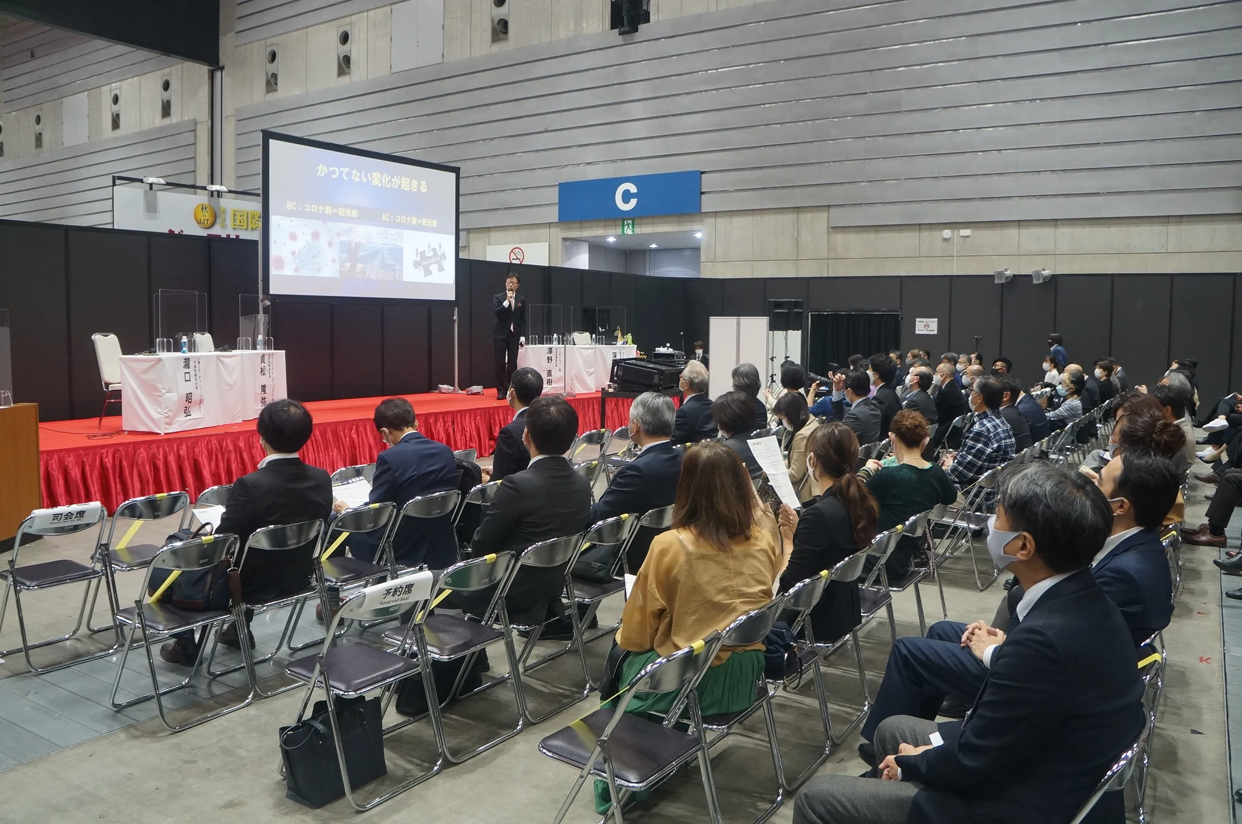 その中で10月28日(水)に開催された特別講演『どうなる?コロナ後の宝飾業界!~業界大手によるトークセッション~』にて、当社の代表取締役社長である澤野直樹がパネリストとして登壇し、コロナ収束後の業界予測やジュエリー業界におけるデジタル化などのテーマに合わせ、トークセッションを行いました。当社以外にも、フェスタリアホールディングス株式会社、株式会社エフ・ディ・シィ・プロダクツが参加をされ、ブライダルジュエリーを扱う3社が同時登壇をし、コロナ禍でのブライダルジュエリー業界についてトークをするという貴重な機会となったため、多くの聴講者を集め、会場は大盛況となりました。また今後のブライダルジュエリー業界について、3社ともに「業界内の企業間のつながりを強化し、一丸となって業界を盛り上げていきたい」という力強い想いを発信いたしました。