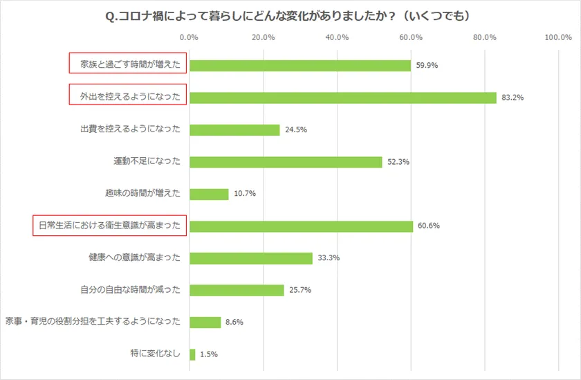 今回の調査で、「コロナ禍によって暮らしにどんな変化があったか」を聞いたところ、8割以上が「外出を控えるようになった」(83.2%)と答え、「日常生活における衛生意識が高まった」(60.6%)、「家族と過ごす時間が増えた」(59.9%)という人が約6割という結果になりました。また約4割の男性が「オンラインでの会議が増えた」(42.1%)、「自宅でのテレワークの機会が増えた」(41.1%)と回答しました。