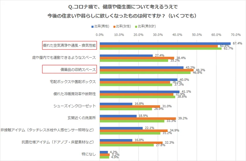続いて「コロナ禍で今後の住まいや暮らしに欲しくなったもの」について尋ねたところ、「広いリビング」が48.0%、「遊べる広い庭・屋上・バルコニー」が46.8%となり、「健康や衛生面で、今後欲しいもの」では「優れた空気清浄や通風・換気性能」が62.7%、「備蓄品の収納スペース」が46.8%という結果になりました。また、男女別でみると「コロナ禍で今後の住まいや暮らしに欲しくなったもの」の男性1位は「自分専用の個室や間仕切りされたスペース」で52.6%、女性1位は「遊べる広い庭・屋上・バルコニー」で52.2%という結果になりました。