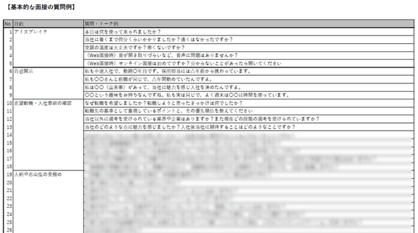 - 面接の目的別の人事担当者向け質問例(アイスブレイク、自己開示、志望動機の確認、人柄の見極め、能力の見極め、退職理由や本音の把握等)