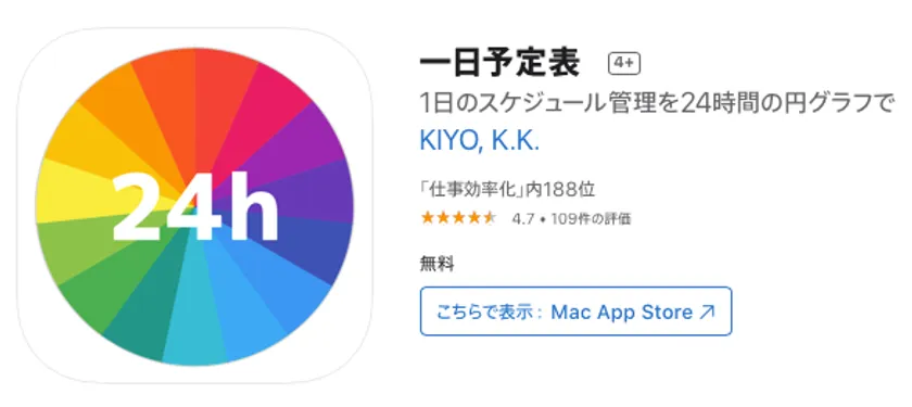 1日の予定表を24時間の円グラフで表示し、さらに合計時間の自動計算・グラフでの推移表示・日記の登録や目標の設定などが行える多機能な無料アプリです。