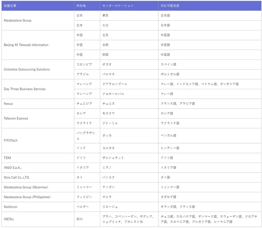 マスターピース・グループ株式会社(東京都港区、代表者:佐藤 修)は、フランスのINETcc(CEO:Denis Guittet)、コロンビアのColombia Outsourcing Solutions S.A.S.(CEO:Felipe Samper)、イタリアのINGO S.p.A.(CEO:Marco Durante)、中国北京のBeijing 95teleweb Information Co.,Ltd.(CEO:Wang Yuan/汪遠)の計5社と発足いたしました“GBA Global BPO Alliance Pte. Ltd.”(以下、「GBA」)にて、28ヶ国語の対応が可能なBPOサービスの提供を、11月1日よりスタートいたしました。