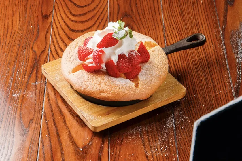 ふわふわとした食感のボリュームある生地の上にたっぷりとイチゴをトッピングしたパンケーキです。