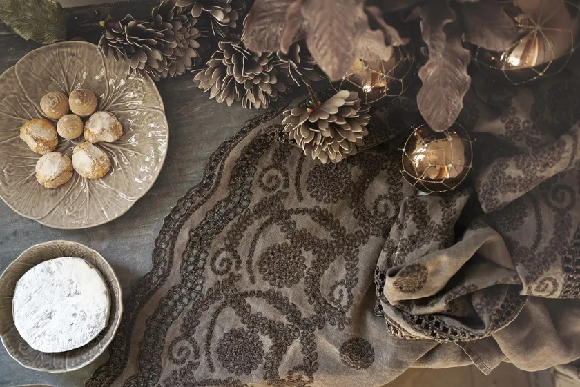 ・“チョコレート・ブラウン色”の透かし刺繍入りの洗いざらしリネンを重ねて、シックに