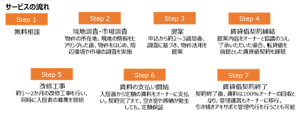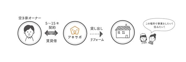首都圏を中心に、空き家を「アキサポ」が借り受け、「アキサポ」全額費用負担でリノベーション工事を行い、