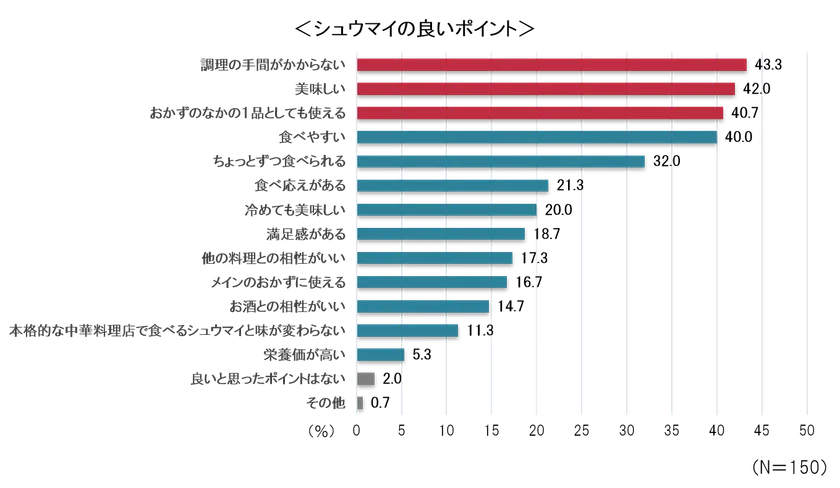 外出自粛前はあまり食べていなかった冷凍シュウマイを食べてみて、良いと思ったポイントを聞いたところ、1位は「調理の手間がかからない(43.3%)」、「美味しい(42.0%)」、「おかずのなかの1品としても使える(40.7%)」が続きました。味の評価に加え、ニーズが高まった使い勝手の点でも高く評価されている結果となりました。一方で、「冷めても美味しい(20.0%)」や「お酒との相性がいい(14.7%)」など、冷凍シュウマイの強みと言えるポイントを回答した人は少なく、まだまだ冷凍シュウマイの特長が浸透していない実態も明らかになりました。