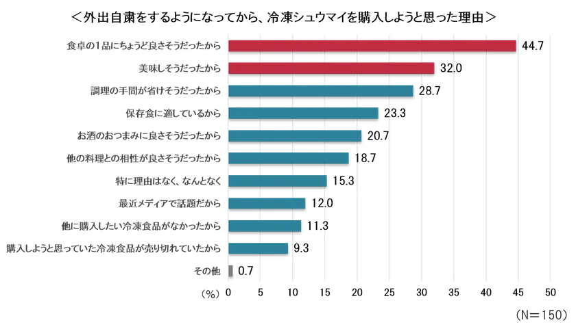 外出自粛をするようになってから、冷凍シュウマイを購入しようと思った理由については、「食卓の1品にちょうど良さそうだったから(44.7%)」が最も多い回答となりました。2位は「美味しそうだったから(32.0%)」で味への関心でしたが、3位は「調理の手間が省けそうだったから(28.7%)」で、冷凍シュウマイは、在宅時間が増えて料理をする機会が増えた人たちにとって、手助けをしてくれる食材として期待されたことが分かりました。