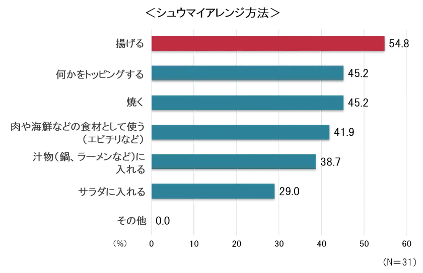 冷凍シュウマイを「アレンジして食べたことがある」と回答した人は2割程度で、8割近くの人がまだ「アレンジをして食べた経験がない」ことが分かりました。アレンジ経験者に、どのようにアレンジをして食べたかを聞いたところ、複数回答をした方が多く、「揚げる」、「焼く」、「何かをトッピングする」など、いろいろなアレンジ方法を楽しんでいることが分かりました。