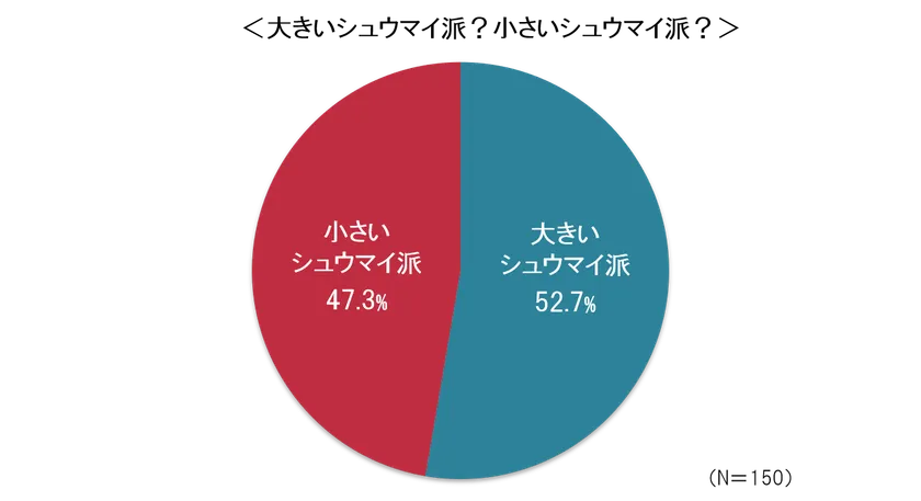 最後に、言われてみれば気になる、「大きいシュウマイ」と「小さいシュウマイ」のどちらが好きかを聞いた設問では、52.7%の人が「大きいシュウマイ」と回答し、僅差で「大きいシュウマイ派」の勝利となりました。最近ではシュウマイ専門店も増え、バリエーションも豊富なシュウマイに「食べ応え」を求める方も増えてきているのかもしれません。