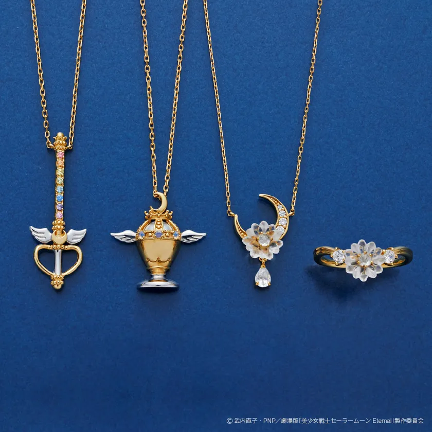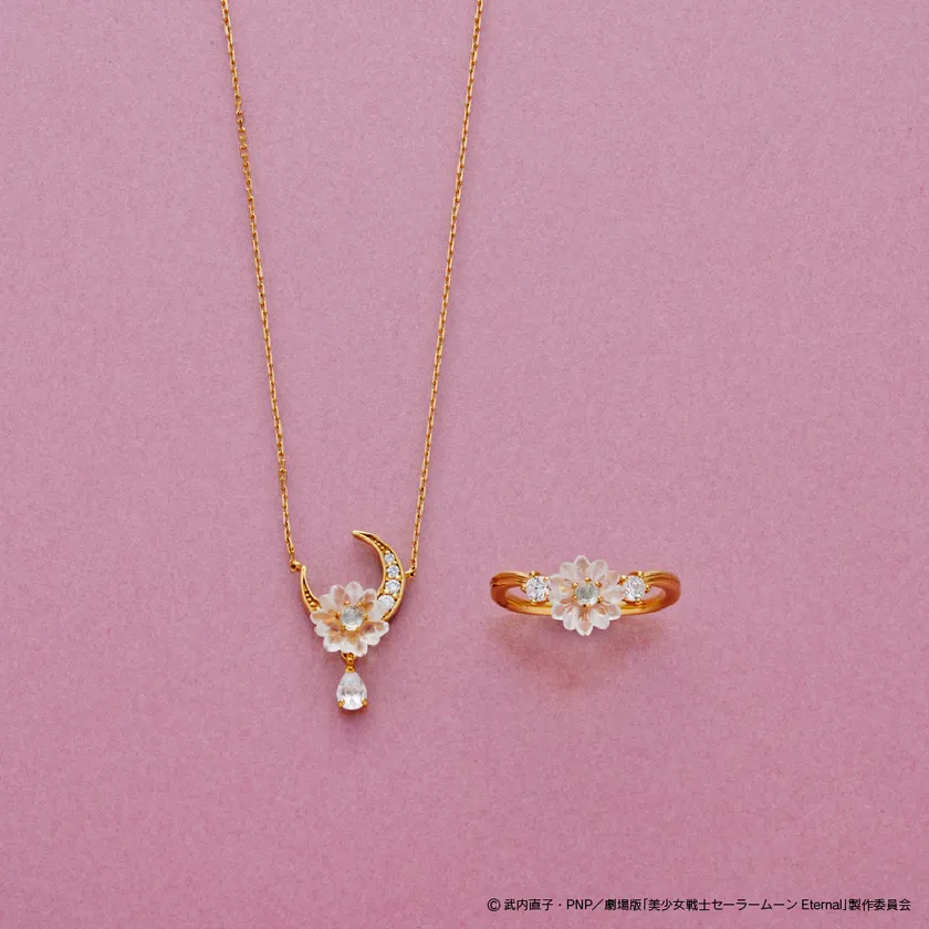 スーパーセーラームーンのコスチュームをイメージした三日月のネックレスとリング。