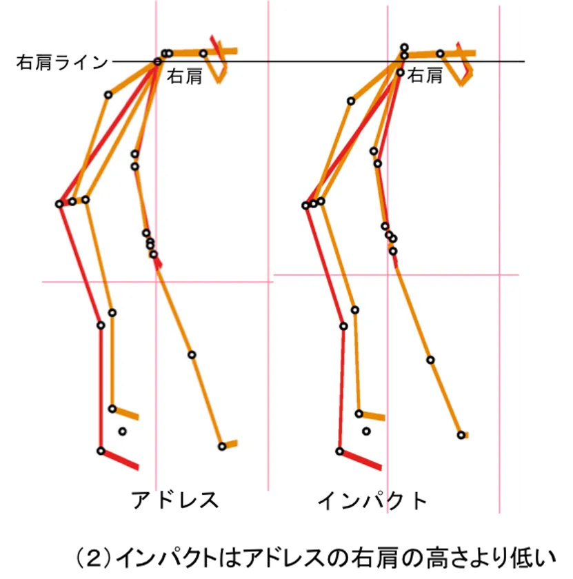 (3) インパクトの右肩の高さがアドレスより高ければ引っ掛け傾向が強い