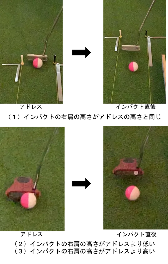 (2) インパクトの右肩の高さがアドレスより低くければプッシュ傾向が強い