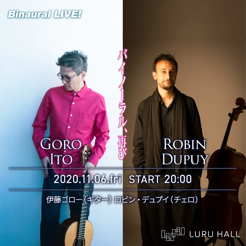LURU HALL(運営:山田産業株式会社、所在地:和歌山市)では、アルバム『アーキテクト・ジョビン』がハイレゾ音源大賞を受賞し、映画『思い、思われ、ふり、ふられ』、TVアニメ『アルテ』などの音楽や、近年の原田知世の音楽プロデュースも手掛る、“コードの魔術師”作曲家/ギタリストの伊藤ゴローと、映画『のだめカンタービレ』出演や、多数の著名アーティストとの共演実績があり、表現の新境地を開拓し続けるチェリスト Robin Dupuyによるバイノーラル配信コンサートを11月6日(金)に開催いたします。