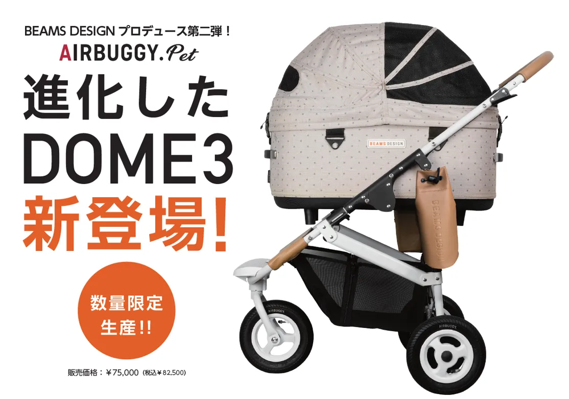 『BEAMS DESIGN』プロデュース第二弾となるドッグカート(AIRBUGGY DOME3)は、室内空間を20%拡大したほか、新たな機能を多く加えました。弊社ECサイト「Calulu ONLINE STORE」とイオンペット株式会社が運営するペットショップの一部店舗にて販売中です。数量限定生産の為、無くなり次第終了となります。