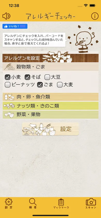アプリ内の「スキャン」で商品バーコードにかざす以外にも、「商品名」で商品を検索し、アレルギー成分が含まれているかを確認することもできます。