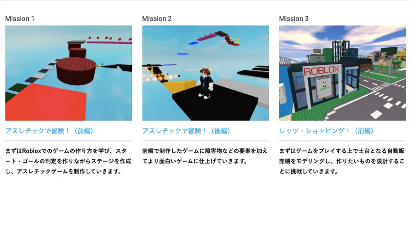 ゲームだけでなく学習教材として名高いRobloxは、ビジュアルプログラミングの基本を学んだ後に、さらに学習深度を高めるのに適しており、本コースは、Scratchなどでプログラミング学習経験のある子供たちにおすすめのコースとなっています。