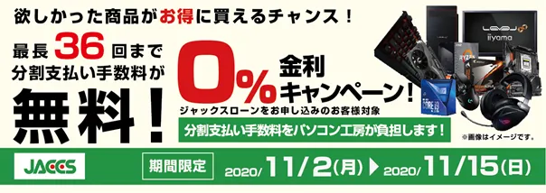 パソコン工房・グッドウィルを運営する株式会社ユニットコム(代表取締役:端田泰三、本社:大阪市浪速区)は、パソコン工房 Web サイトおよび全国のパソコン工房・グッドウィル各店舗にて、ジャックスショッピングローンをご利用の場合、分割支払い金利手数料が最長36 回まで無料になる『ショッピングローン 0%金利キャンペーン』を 2020 年 11 月 2 日(月)より開始しました。