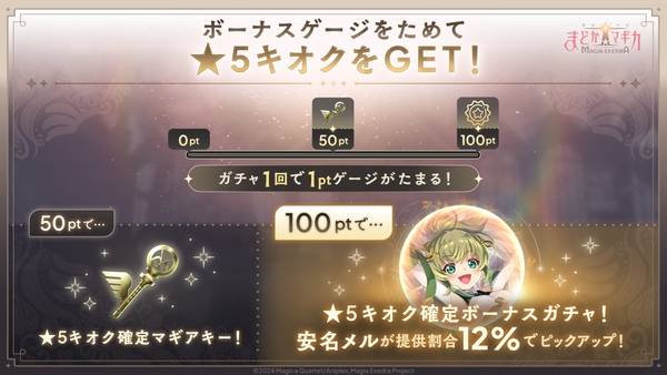 今回のガチャには「ボーナスゲージ」が付いており、ガチャ1回で1Ptゲージがたまり、50Ptに達するとピックアップ対象も封入された★5キオク確定のボーナスガチャを1回引くことができます。