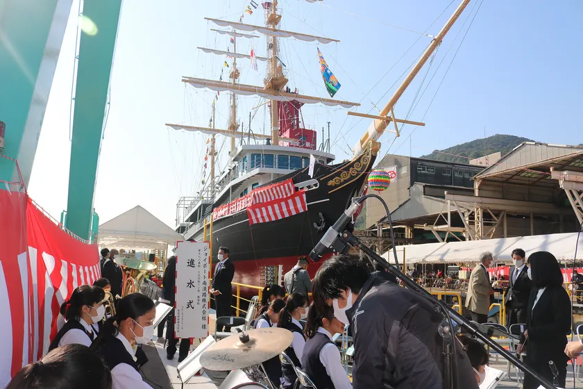 うずしおクルーズを運営するジョイポート南淡路株式会社(所在地:兵庫県南あわじ市福良、代表取締役:鎌田勝義)は、2020年10月31日(土)本瓦造船株式会社(所在地:広島県福山市)において、うずしおクルーズの新造船の命名・進水式を執り行いました。新しい船は「咸臨丸(かんりんまる)」と命名し、うずしおクルーズには、2021年3月に就航する予定です。