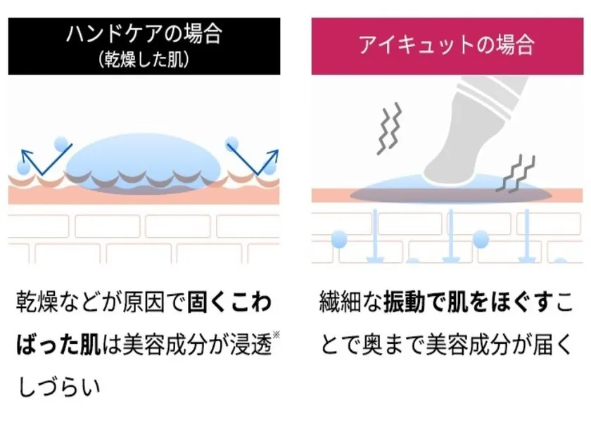 1日に約1.9万回の瞬きを繰り返し行い、現代社会においてはパソコン・スマートフォンの長時間使用などで知らず知らずに目を酷使しています。皮膚の薄い目もとは変化が現れやすく、お肌悩みの代表として挙げられる「シワ」や「乾燥」を特に感じやすいパーツです。マスク着用が必須とされる近年では、目もとが人の印象を決める第1のパーツとなるでしょう。そこで、簡単に自宅で目もとトレーニングができる電動アイケア「アイキュット マッサージャークリーム」を新たにラインナップいたしました。日本では未だ珍しく高価なアイケアに使用されていることの多い電動アプリケーターを採用し、振動により筋肉をほぐしながら角質層まで美容成分をすばやく浸透させます。また、質感にこだわったスフレ状クリームがベタつかずに密着し、うるおいを与えてピンとハリのあるふっくら明るい目もとへ導きます。