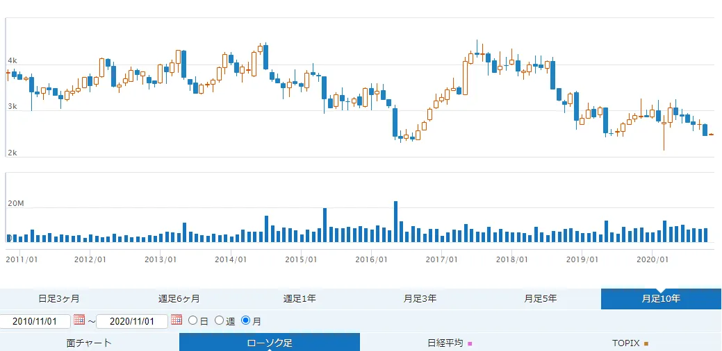既存の株価チャートは月足5年までが最大表示できる期間でしたが、新しいバージョンでは月足10年まで表示できるようになりました。