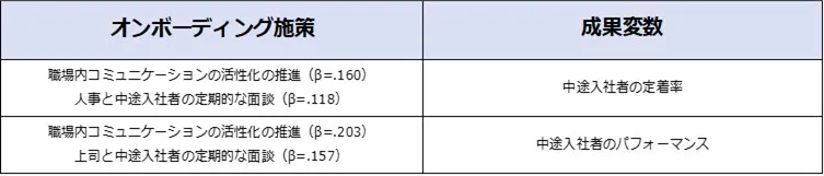 オンボーディング施策の実施を独立変数、中途採用者の離職率の低下やパフォーマンスの向上を成果変数とした重回帰分析(ステップワイズ法)