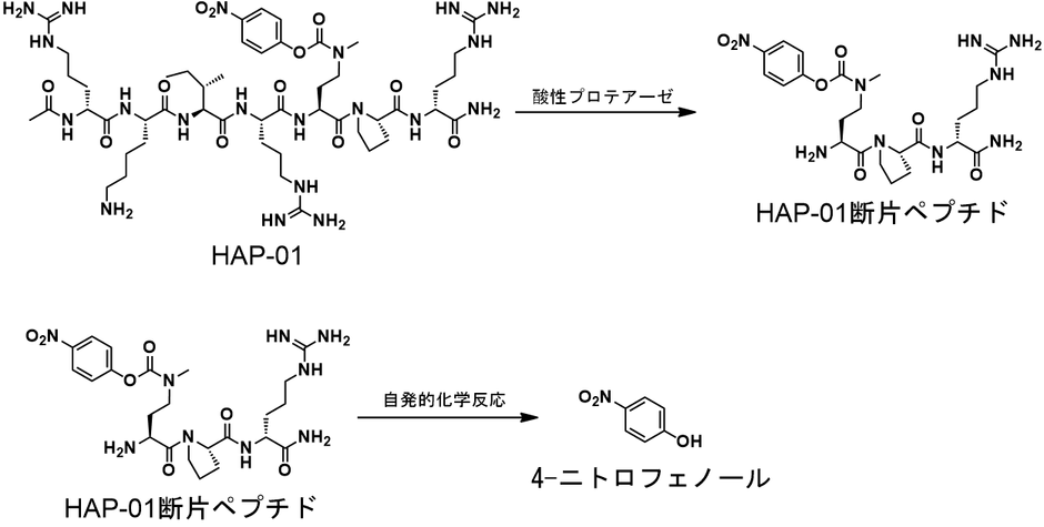 基質溶液に含まれる合成基質HAP-01が、酸性プロテアーゼによって分解されます(酵素反応)。pH調整液を加えて煮沸すると酸性プロテアーゼが失活し(失活反応)、同時に、酵素反応で生じたHAP-01断片ペプチドから4-ニトロフェノールが遊離します。その際、酵素反応しなかったHAP-01からは4-ニトロフェノールは、ほぼ遊離しません。さらにpH調整液を加えたアルカリ条件下で4-ニトロフェノールを発色させた後(発色反応)、波長400 nmの吸光度を測定し、換算式により酸性プロテアーゼの活性値を求めます。