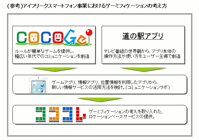 アイフリークは、従来の装飾メールで培われた時代のコミュニケーション手法から、スマートフォンが普及する時代の新しいコミュニケーションの形を創造するべく、「ココゲー」「道の駅アプリ」「コココレ」をはじめとするアプリケーション群と、ゲーミフィケーションの考え方を取り入れたサービスを構築すべく、コミュニケーションラボ(福岡県)での研究開発(R&D)を行ってまいります。