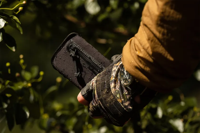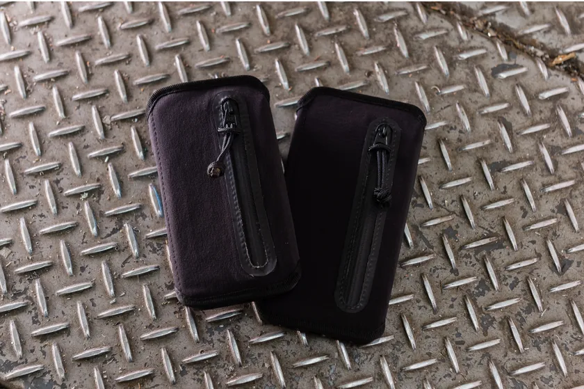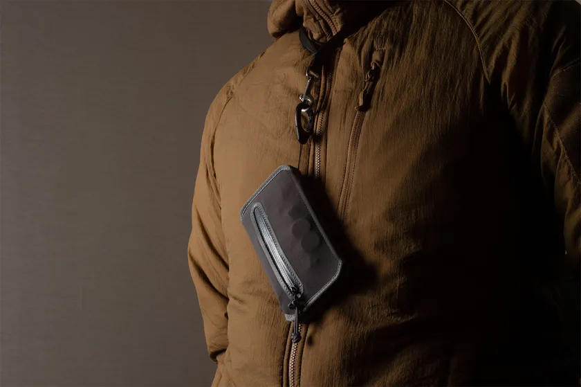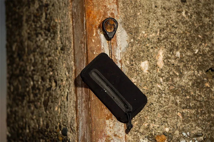 撥水ストレッチ素材で カード10枚+紙幣5枚+コイン20枚+名刺10枚+鍵を楽々収納! 専用カラビナでネックストラップにも装着可能。