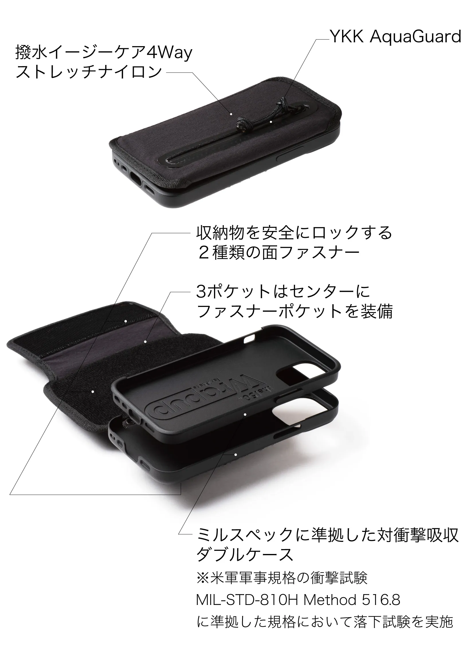 1. iPhone本体を守るケース部分は耐衝撃性のあるミルスペック準拠のダブルケースを採用!