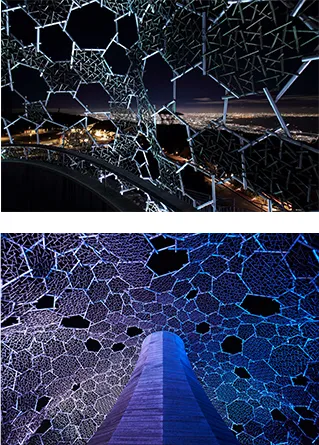 1000万色以上の色彩表現が可能なLED照明を使って「自然体感展望台 六甲枝垂れ」をライトアップします。