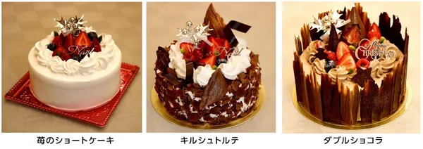 クリスマスの定番「苺のショートケーキ」をはじめ、さくらんぼのお酒を使用した「キルシュトルテ」、2種類のチョコレートが楽しめる「ダブルショコラ」、計3種類のケーキをご用意しております。