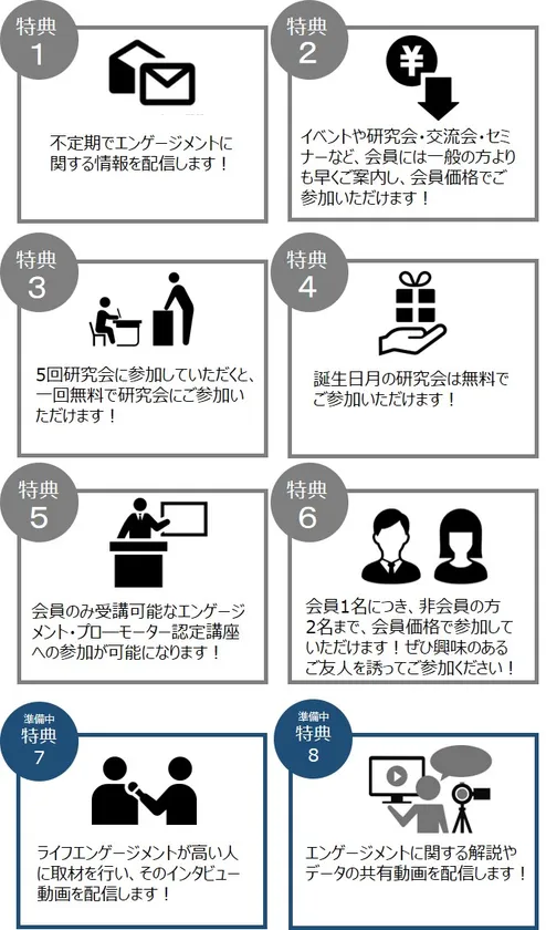 仕事におけるワーク・エンゲージメント、自身の人生におけるライフ・エンゲージメント、ソーシャル・エンゲージメントも高めることが出来る活動をサポートすべく、会員には特典として以下のコンテンツを提供します。