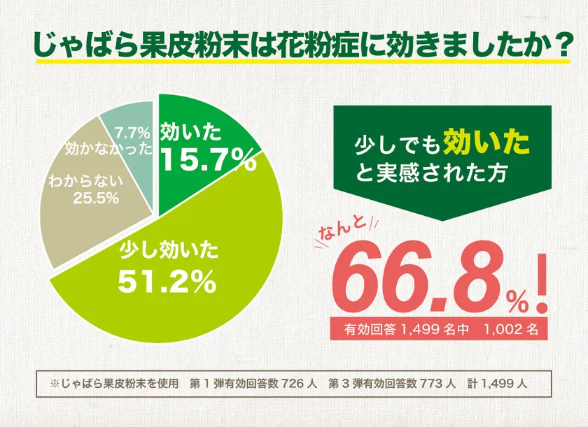 「じゃばら果皮粉末」を使用した調査では、効いた、または少しでも効いたと回答された方が1,002名と、66.8%の方が花粉症に何かしらの効果を実感したという結果になりました。