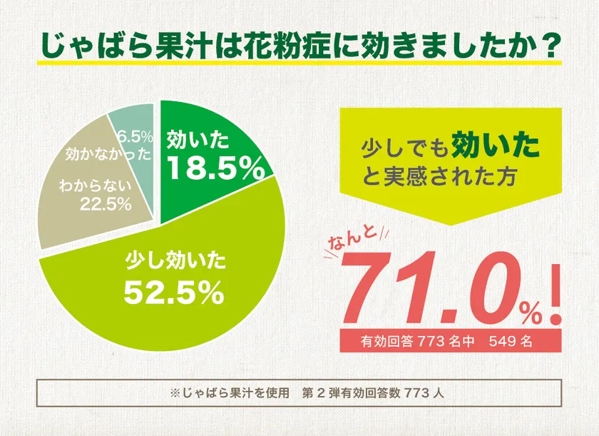 「じゃばら果汁」を使用した調査では、効いた、または少しでも効いたと回答された方が549名と、71.0%の方が花粉症に何かしらの効果を実感したという結果になりました。