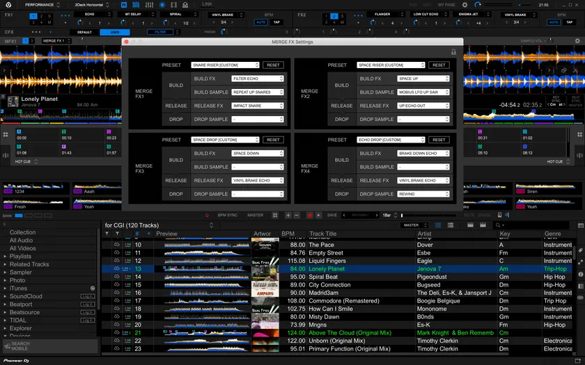 新しいMERGE FX機能では、複数のエフェクトやサンプルを1つのノブでコントロールすることで、ビルドアップやブレイクダウンを作り出し、異なるBPMやキーを持つまったく違ったジャンルの楽曲を、大胆にミックスすることが可能になります。