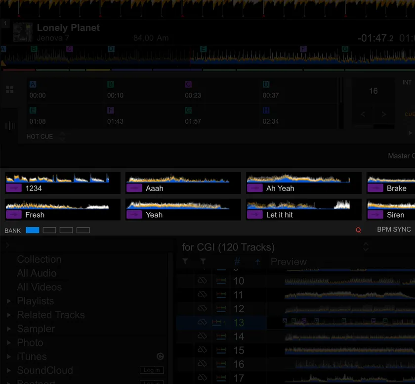 本機はサウンドカードを内蔵しており、rekordboxのDJ PERFORMANCE機能とSerato DJ Proに対応しています。有料サブスクリプションプランを契約する必要がなく、本機をどちらかのソフトウェアが起動しているPC/MacにUSBケーブルで接続するだけですぐにDJプレイを始められ、どちらのソフトウェアを選択しても、豊富な機能でクリエイティブなプレイを楽しむことができます。