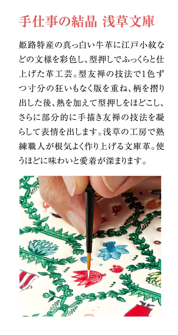 ■浅草文庫とは、播州姫路伝統の白くなめした牛革に友禅染の手法で色鮮やかな柄をあしらい、型押しでふっくらとした質感に仕上げた日本伝統の革工芸です。