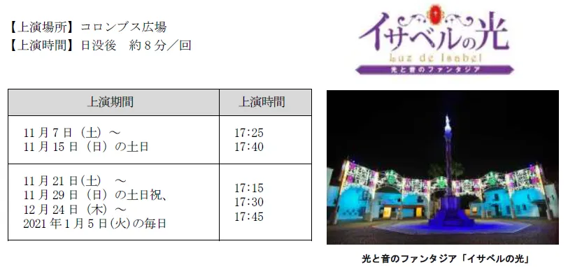 夕日が沈む頃、コロンブス像を主役とした、全長35mの大型光ゲートが輝きます。コロンブスへ希望の光を贈ったスペイン初代女王イサベルをテーマに、心の葛藤や未来への「夢と希望」を表現した光と音のエンターテイメントです。